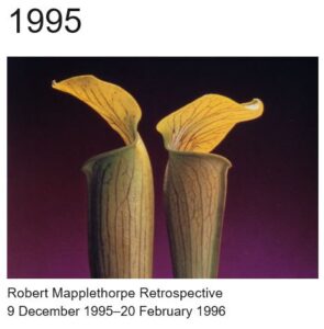 The diverse material we scanned for City Gallery included: pamphlets, exhibition catalogues (which were actually small books), invitations and posters. We also digitised photographs of exhibitions in the form of varying sized prints, slides and medium format transparencies; we even digitised some audio and visual material. The Robert Mapplethorpe Retrospective Exhibition from 1995 has an interesting mix of digitised material, from exhibition advertisements and documents to TV coverage.