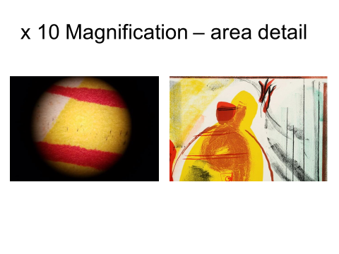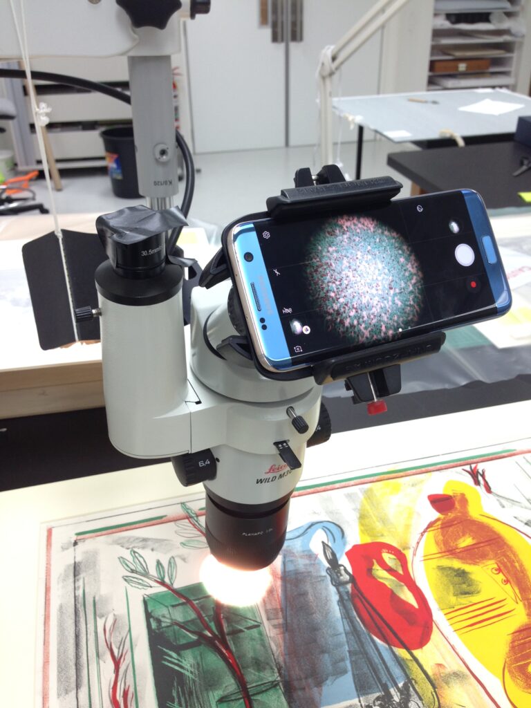 “These images show how I take photographs with the microscope, using a smart phone holder that has been developed for exactly this purpose. I used it to take photos of Frances M Hodgkins (1869 – 1947) lithographic print, Arrangement of Jugs (1937) and the image on the left shows how the inks look under magnification. Printed colour, no reproduction dots.” – Camilla Baskcomb