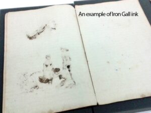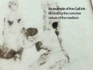 We explored the well-known issue of Iron Gall ink with examples on display from the ‘First Mate’ on the Ship “Eagle” – one James Cook. You can clearly see the ink causing corrosion as it continues to etch into the paper. This creates potential issues with legibility and of course the ink may eventually cause irreparable damage to the page.