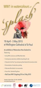 As part of the Splash 2015 exhibition (Theme WW1 in watercolour), Exhibition Manager Claire Clark sourced and coordinated the retrieval of works from seven ‘guest artists’ – servicemen who painted/drew while serving during WW1 – from Archives NZ offices around the country. NZMS was called into service for the digitising and reprinting of these works designed to complement the contemporary offerings from the talented artists of Watercolour New Zealand.