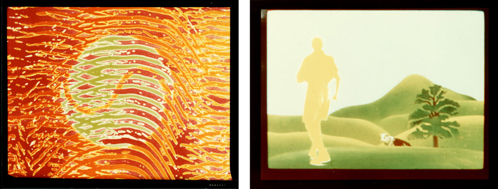Lye’s innovative technique of painting or scratching patterns directly onto film gives his work a witty and whimsical quality. He used processes of colour printing, jump-cutting, stop-frame animation, and synchronising visuals with music to create a truly innovative films. A lot of his work shows influences of Māori, Samoan, and Aboriginal art. This is particularly noticeable in the film Tusalava (1929) which tells the story of the witchetty grub, a source of food for the Aboriginal people. Lye had an enduring interest in Pacific imagery, patterns, myths, and legends and this is not only found in his films but also in his paintings, drawings, and artistic theories.