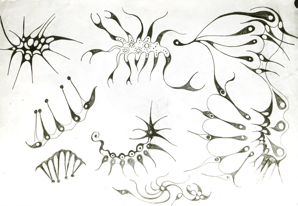 While the breadth of the collection is crucial to our understanding of Lye as an artist, it is especially true of the pieces described as “doodles.” This method was at the heart of Lye’s practice throughout his career and underpinned his stylistic choices by resonating with intuitive movement.