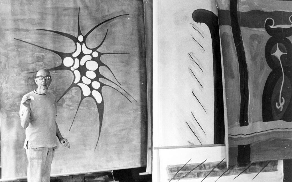 In his late seventies, Lye reconnected with Aotearoa when the Govett-Brewster offered to hold a solo exhibition featuring his kinetic sculptures. He was impressed with the ability of the people he worked with and their passion to realise his motorised sculptures on an even larger scale. This experience in New Plymouth prompted him to set up The Len Lye Foundation so that he could gift his entire archive of paintings, sketches, drawings, models, and manuscripts to the Govett-Brewster — ensuring the works remained cared for and managed after his death.