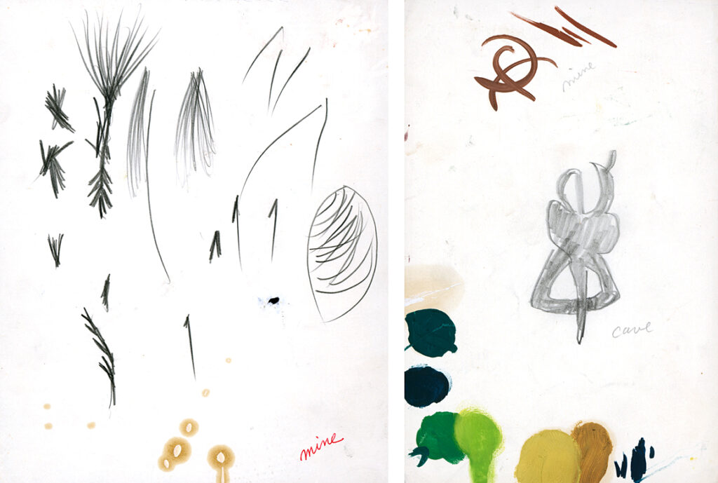 Alternatively, Lye described some of the doodles he created as cave/mine drawings. Paul Brobbel explains that “these were experiments in identifying the workings of the ‘old brain and new brain’ creativity at play in his work. Lye felt his work was adept at drawing inspiration from the ancient intellect of mankind’s collective old brain. These ‘doodles’ were exercises in automatic drawing in which he would identify and categorise each as either coming from the ‘cave’ (our shared ancient brain) or otherwise as coming from ‘mine’ (his own modern ‘new brain’). This exercise helped Lye refine his artistic process and it also provides us with an insight into his workings and sense of experimental drawing.”