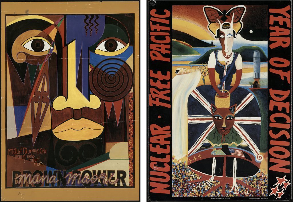 Right: Nuclear-Free Pacific: Year of Decision, 1980s, Therese O’Connell Poster Collection, Tapuaka Heritage & Archive Collections.