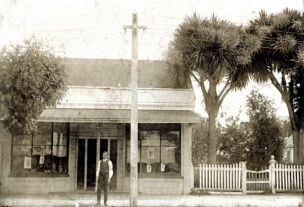This photograph shows a man called Mr. Bhukhandas Luxmidas Mastar outside his tailor’s shop on the main street of Te Puke. He had a long tenure in Te Puke, spanning from 1924 to 1949, and was well-known in the community. He eventually closed his shop when he returned to India where he spent the remainder of his life. Meanwhile, his two sons chose to remain in Te Puke and his grandson, Harendra, currently resides in Wellington.